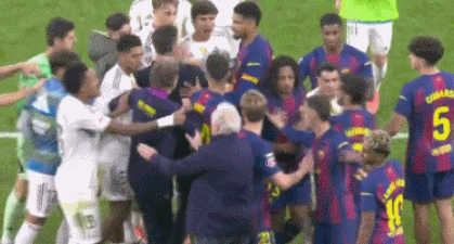 随后当主裁判吹响结束的哨声,场上的双方球员发生冲突,此战诠释了西班牙国家德比的火爆!